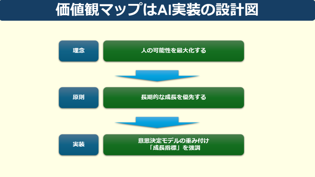 このように価値観を「翻訳」してAIに埋め込むことで、AIは単なる効率化装置から、理念を体現する存在へと近づきます。