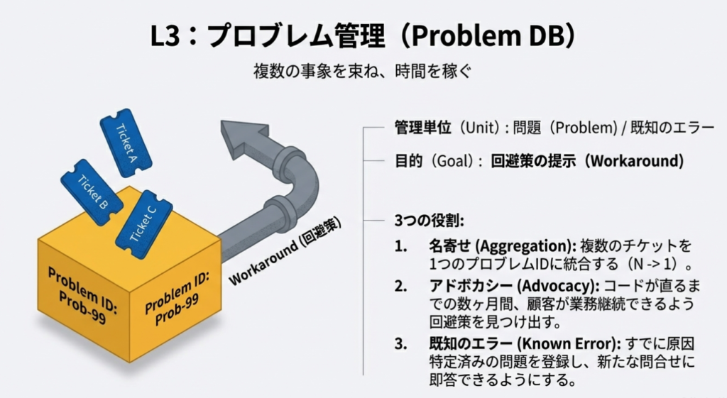 L3の重要な仕事は、開発のエスカレーションだけではありません。コードが直るまでの数ヶ月間、顧客が業務を継続できるように回避策(Workaround)を見つけ出し、提示することです。 また、すでに原因が特定されているが修正パッチ待ちの状態を既知のエラー(Known Error)として登録し、同じ問合せが来た際に即答できるようにします。