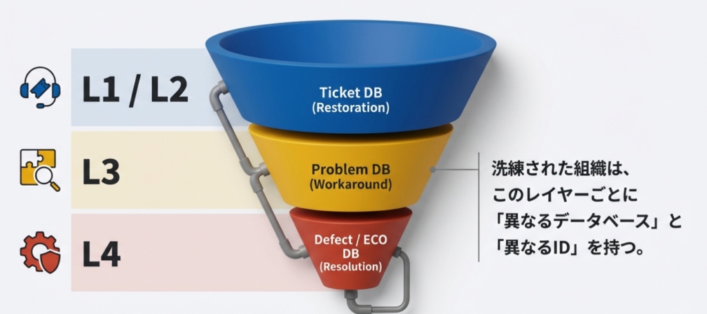 すべての事象を1つのシート、1つのID体系で管理しようとすると、事象の管理なのか、問題の管理なのか混乱することがあります。 洗練された組織では、それぞれのレイヤーは異なるデータベース(DB)で管理され、異なる管理IDを持っています。