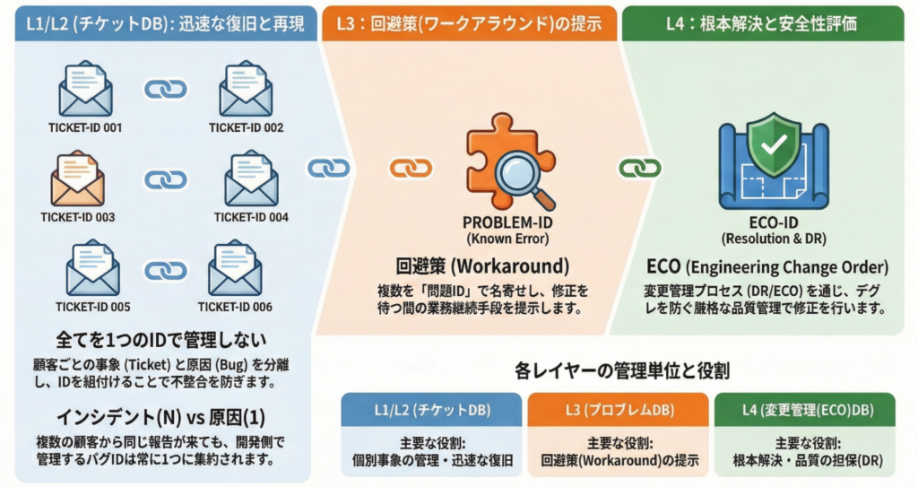 - バグDB(L3/L4):原因を管理します。A社とB社の事象が同じバグに起因する場合、開発側で管理するバグIDは1つです。