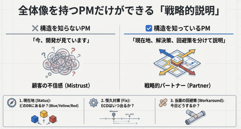 - 構造を知っているPM: 「現在、御社のチケット(ID: Ticket-123)は、開発部門の問題管理DB(ID: Problem-456)に紐付けられ、原因は特定されました(既知のエラー化)。 現在、恒久対策コードは変更管理プロセスを経て次期パッチに含まれる予定ですが、それまでの間はL3チームが策定した回避策(ワークアラウンド)を適用することで、業務への影響を最小化できます。 ※もし業務停止レベルであれば、リスクを取って緊急変更(Hotfix)を要請しますので、その際は御社側での緊急適用検証(Verification)のご協力をお願いします」