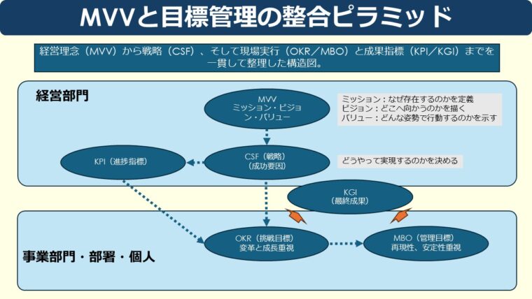 MVVは「存在意義」、OKRやMBOは「実践」、KPIやKGIは「成果測定」。この流れを整理すると、理念から現場の業務までが一貫して見えてきます。