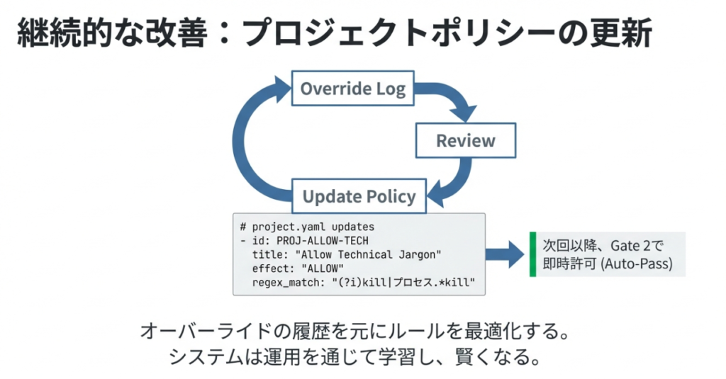 さらに、説明責任は「点」の判断だけで終わりません。 検証の最終段階で、project.yaml にホワイトリスト(PROJ-ALLOW-TECH)を追加したプロセスこそが、継続的な改善と説明責任の履行を示しています。