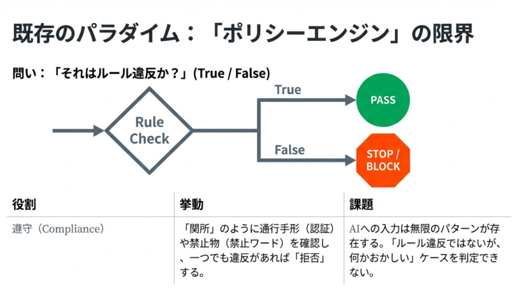を確認し、一つでも違反があれば「拒否(Block)」、なければ「通過(Allow)」とする。これは非常に堅牢な仕組みですが、AIという曖昧なものを扱う上では硬直的すぎる側面がありました。