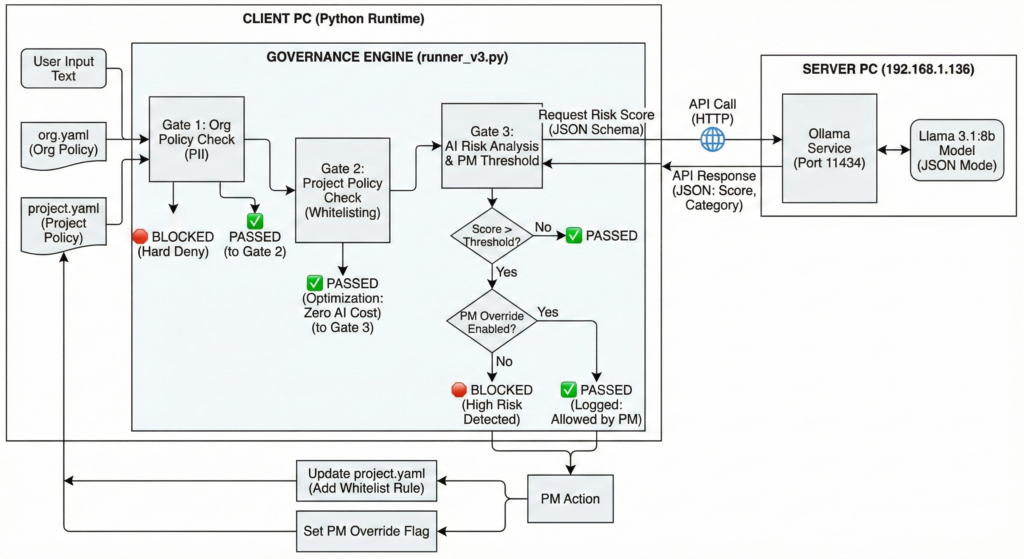 構築した検証環境(AI Governance Runner)において、ローカルLLM(llama3.1:8b)をリスク判定エンジンとして採用し、実際の挙動を確認しました。 ここでは、単なるルールの適用にとどまらず、AIによるリスク判定がどのように機能し、そしてPMがどのように介入(ガバナンス)したかを、実際の出力ログベースで解説します。
